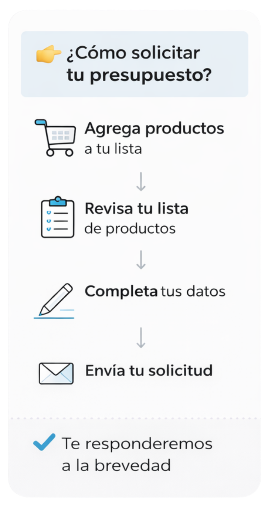 SOLICITA TU PRESUPUESTO AQUÍ. AÑADE LOS PRODUCTOS A TU CARRITO Y SOLICITA UN PRESUPUESTO FORMAL.
